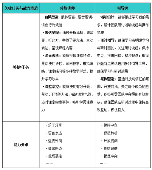 因此,引導師的關鍵任務與能力要求都不同于傳統講師: